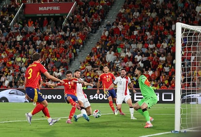 En el medio, Pedri, el faro, exploraba de un lado a otro la solidez la fortaleza de Georgia, que colocó un centinela para perseguir y anular a Zubimendi. Merino buscaba lugares avanzados entre líneas desde los que ayudar a progresar. Mientras ellos oteaban el panorama, la agitación llegó por la banda derecha de Lamine, aunque no de un extremo, sino de un poco más atrás. El territorio abarrotado dificultaba los asaltos por tierra y Pedro Porro, que cubre la ausencia de Carvajal, abrió la vía aérea. El lateral del Tottenham, que incluso tiró al palo, desplegó un muestrario de centros que buscaban las cabezas de Oyarzabal y Mikel Merino, y desconcertaron a Mamardashvil. Dos de los que caían al segundo palo se convirtieron en problemas imposibles de descifrar para el portero del Liverpool, que solo acertó a despejar a córner balones que parecía que podía haber atrapado con sencillez.