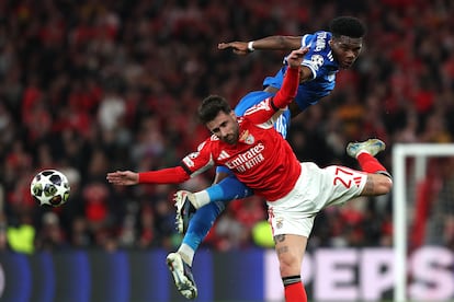 El Madrid apenas permitió nada más. Fue hundiendo al Benfica. Subía la temperatura de la caldera. El balón le corría más rápido, cada vez más a menudo al primer toque, más y más cerca de la portería de los portugueses. Y empezó a derrumbarse un chaparrón de tiros sobre Trubin. El ucranio, célebre por marcar 20 días antes en el 98, emergió esta vez para desactivar la batería de ocasiones. Hasta que apareció Vinicius, que estaba pasando la noche amarrado por Dedic. El brasileño había probado por fuera, por dentro, acelerando y frenando. El bosnio no se despistaba. Pero después de un regate vio que parecía perder pie, presionó el gatillo y colocó la pelota en la escuadra más lejana.
