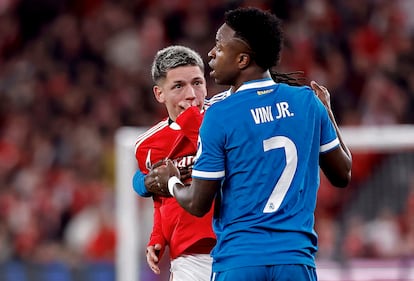El Benfica - Real Madrid de Champions de este martes se detuvo durante 10 minutos zarandeado por el racismo en el fútbol. Lo que nadie niega de lo ocurrido en Lisboa es que el jugador del equipo portugués Gianluca Prestianni se tapó la boca con la camiseta, al menos tres veces, para decirle algo a Vinicius, según captaron las imágenes de televisión. El árbitro, el francés François Letexier, activó de inmediato el protocolo antirracismo en cuanto el brasileño denunció los insultos xenófobos que, según su testimonio, recibió del argentino. Ahora es el turno de la UEFA, que contempla en su código disciplinario una sanción de, al menos, diez partidos por este motivo.