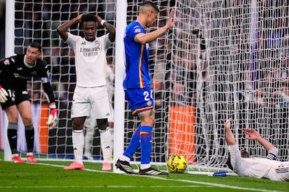 A falta de manual, al Madrid le quedaba apelar a los raptos de genio: la insistencia de Vinicius o una ruleta con la que Güler se coló en el área y probó los notables reflejos de Soria. Y así, poco a poco, la aspereza y el orden del Getafe iban desgastando el academicismo monótono del equipo de Arbeloa, al que se le abrían cada vez más las costuras. Hasta que la deconstrucción futbolística alcanzó su punto culminante. El balón, como ingrávido, abandonó la hierba y comenzó a saltar de cabeza en cabeza, un globo travieso y fuera de control que Arambarri dirigió hacia Satriano con un último frentazo peleado con Tchoaumeni. El uruguayo tampoco permitió que el balón tocara tierra: lo coló por la escuadra de volea y al Bernabéu se le atragantó un poco más el bocado de Bordalás. Regresaron los silbidos mientras el Getafe sostenía su convicción.