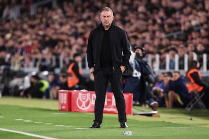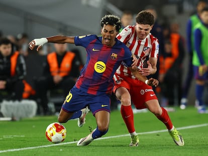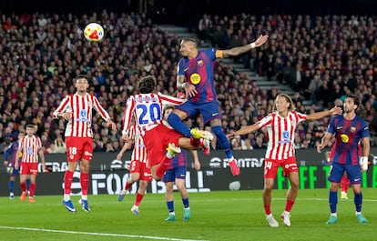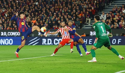 No le quedaba más remedio al Barça que chutar desde media distancia —un tiro de Fermín tocó el larguero— porque los balones cruzados por Raphinha tampoco encontraban rematador, pendiente como estaba Ferran de Lamine, bien tapado por la zaga de Simeone. Muy sometido, el Atlético tardó 26 minutos en llegar hasta Joan García y el portero sacó el disparo de Griezmann después de un fuera de juego a Ruggeri. Los rojiblancos no paraban de achicar y de correr detrás del abrasador Barcelona. El matiz de Simeone, que prescindió de Molina para poner a Llorente de lateral y a Cardoso en la medular, apenas tenía incidencia en un partido que el Barça dominaba desde la elaboración y la recuperación para desespero de Simeone.
