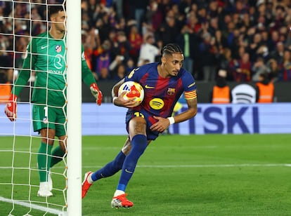 La excitación del equipo azulgrana era tan contagiosa que la hinchada aguardaba el gol en cada llegada de su equipo hasta que marcó Bernal. Lamine se dejó caer por el lado izquierdo, cambió de dirección y su centro fue embocado por Bernal. El partido se abrió con el 1-0 y el Atlético, un poco más sereno, hasta entonces reducido por la adelantada línea defensiva barcelonista, acarició el empate con un cabezazo de Lookman a centro de Llorente. La réplica barcelonista fue contundente porque Pubill cometió penalti sobre Pedri y Raphinha puso el 2-0. Media parte cumplida y media eliminatoria resuelta, como demandaba el plan de Flick. El descanso no atemperó la ambición del Barça, sino que agrandó además la abrumadora superioridad de Lamine sobre Ruggeri.