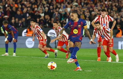 Al Barcelona solo le faltó un gol para forzar la prórroga y coronar una noche enfebrecida que puso a prueba la capacidad de resistencia del plantel del Cholo Simeone, que vuelve a la disputa del título 13 años después, cuando ganó la Copa contra el Madrid en 2013. Ausente Eric por sanción, la presencia de Cancelo como lateral zurdo reforzó la vocación ofensiva del Barça, ya con Pedri en la sala de máquinas y Olmo en el banquillo al lado de Rashford. El Barça miraba hacia la portería de Musso con la esperanza de que Gerard Martín cerrara mejor que Araujo y que el dinamismo de Ferran compensara la falta del lesionado Lewandowski. Ni siquiera la lesión de Koundé alteró la voracidad del Barça. El ritmo azulgrana era tan intenso como diabólico, de una gran exigencia física por la fuerte presión, muy bien desplegados los futbolistas en cancha contraria y rápidos también en el repliegue, faltos si acaso de puntería y de ocasiones porque el Atlético, muy replegado, apenas concedía espacios ante Musso.