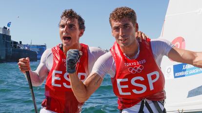 Jordi Xammar y Nico Rodríguez han conseguido este miércoles la segunda medalla para la vela española en los Juegos de Tokio: bronce en la clase 470, después del también bronce de Joan Cardona en Finn. Llegaban a la Medal Race a cuatro puntos de la pareja sueca formada por Anton Dahlberg y Fredrik Bergstrom (que finalmente fue plata); el oro era misión imposible, demasiada la diferencia con los australianos Mathew Belcher y Will Ryan. Lo celebraron los españoles pegando saltos en el barco, al que dieron la vuelta para acabar subidos al casco. Fue tanta la adrenalina, tanta la emoción, tanta la presión, que media hora después de terminar la regata, a Xammar seguían temblándole las manos en la zona mixta; todavía estaba en estado de trance, no se acordaba siquiera haberse subido al casco de la embarcación.