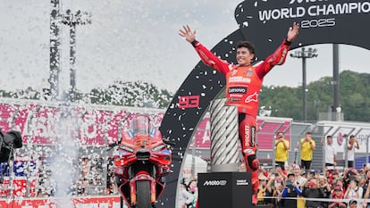 Marc Márquez ha puesto este domingo el broche de oro a su extraordinaria e imponente campaña de reconquista en MotoGP, un momento que venía persiguiendo a lo largo del último lustro, marcado por una profunda crisis física y deportiva. Con una segunda plaza en el GP de Japón, que venció su compañero Pecco Bagnaia, el piloto español culminó con su decimoquinto podio del curso un largo vía crucis para regresar a lo más alto del motociclismo mundial. Seis años después de su anterior alirón, renacido a lomos de la Ducati roja que todos anhelan en la parrilla, el atleta de Cervera levanta a los 32 años su novena corona mundialista, la séptima en la categoría reina, una cifra que le iguala a títulos con Valentino Rossi.