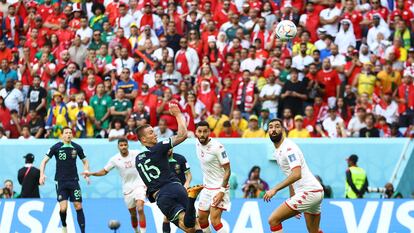 A Túnez se le esperaba tras su interesante exhibición del partido anterior contra Dinamarca. Se aguardaba su codicia y su vigor, abanderado por Laïdouni, el mediocentro del Ferencvaros que es una suerte de Dennis Rodman futbolero y que celebra sus acciones defensivas con una arenga a la grada. Porque Túnez juega el Mundial en casa, sostenido por una bancada repleta que se alimenta de la gran diáspora de compatriotas que viven en la Península Arábiga, particularmente en los emiratos. Pero Australia acalló todo el estrépito, bien trabajada para aplicar una presión sobre los tres centrales rivales, un trío de titanes para fajarse en defensa, pero inanes con la pelota en los pies.