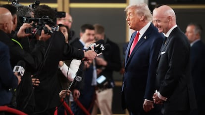 Escoltado por Infantino, Donald Trump hace su entrada al sorteo en Washington, como uno de los anfitriones del torneo.