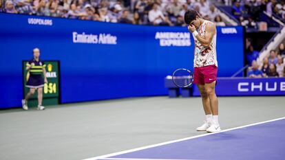 “¡Dale largo hasta que puedas ir! ¡Vamos!”, intenta reanimarle Ferrero desde la esquina. No hay manera. El segundo set se traduce en una tortura. Amaga con lanzar la raqueta, sangran los números. Así lo expresa la estadística: 10 errores no forzados por los tres del ruso, que levita sobre el saque —92% con primeros y 80% con segundos— y hace trizas el suyo —28% de segundos—. Aun así, Alcaraz se resiste a levantar la bandera blanca. El paso por el vestuario tiene un efecto revitalizador para él, reenganchado merced a la inspiración recuperada en la tercera manga. Es un fogonazo, pero le aporta crédito. A Medvedev le puede la ansiedad en esa franja y abandona la guarida para lanzarse erróneamente a la red, con la penalización consiguiente.