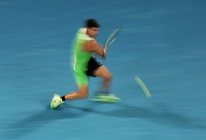 Ahí un hombre orgulloso que escucha al hijo y le lanza un beso, barrera rota: atrás quedaron los cuartos, bienvenidas sean las semifinales de Australia. “Tener este tipo de experiencias era el sueño de mi padre, así que estoy feliz”, dice Carlos Alcaraz, montado sobre unas botas de Michael Jordan después de haber batido a Alex de Miñaur (7-5, 6-2 y 6-1, tras 2h 15m) y haciendo molinillos con la raqueta delante de 15.000 personas y la cámara. Está en su salsa. Empuña el móvil y graba. Lo celebra. Por delante, un luminoso territorio y Alexander Zverev, superior en el turno previo a Learner Tien (6-3, 6-7(5), 6-1 y 7-6(3).