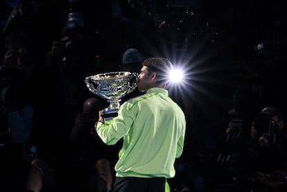 Alcaraz llevaba este último éxito en su cabeza a fuego lento, desde que empezó a pulirse durante la pretemporada en la Real Sociedad Club de Campo de El Palmar. Lo proyectaba, lo imaginaba y ya tiene lo que tanto quería: Australia, el lazo. El dorado Grand Slam —solo nueve tenistas pueden decirle, únicamente cinco en la Era Abierta (1968)— y el ser el más joven en, por enésima vez. Ante los periodistas, como es tradición en Melbourne, levanta la copa de champán y brinda con todos: Cheers! (¡Salud!). Se le nota cansado por la tralla de estas dos semanas, pero todavía tiene fuerzas para emitir un par de mensajes contundentes.