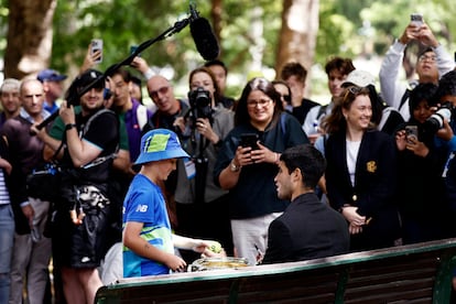 Carlos Alcaraz (El Palmar, Murcia; 22 años) camina a primera hora de la mañana trazando una línea recta de 200 metros por los hermosos jardines del Royal Exhibition Building, en el distrito de Carlton. Al número uno del tenis le envuelve un manto de un centenar de personas y dos largas hileras de plataneros altísimos, intercalados con el colorido de las Cañas de la India. Se divierte posando de oscuro. Cazadora elegante, pantalones de campana y unos mocasines que le dan un aire muy sofisticado. Está cansado, pero de buen humor. La noche previa conquistó por primera vez el Open de Australia y se convirtió a su vez en el jugador más joven que completa el Grand Slam; esto es, ganar al menos una vez el gran torneo oceánico, Roland Garros, Wimbledon y el US Open. Su presencia atrae cada vez a más y más curiosos, de modo que la conversación con EL PAÍS transcurrirá finalmente en la tercera planta del Hotel Crown, donde se ha hospedado durante estas tres semanas de sudores, progresión y, al final, éxtasis. Le tiran más y más fotos. Tiene siete grandes y es una superestrella, pero actúa y contesta como un simple chico de Murcia.