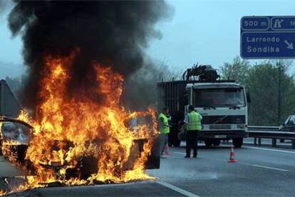 El incendio fortuito de una furgoneta a causa de una avería causó ayer otro notable atasco en los accesos a Bilbao. En esta ocasión, fue en el corredor del Txorierri, a la altura de Derio. El incidente, registrado hacia las 09.15, obligó a cortar durante un breve espacio de tiempo los dos carriles de la autovía en dirección a San Sebastián. El Departamento de Interior afirmó que las retenciones alcanzaron un kilómetro. En la imagen, un ertzaina dirige el tráfico cuando se abrió uno de los dos carriles.