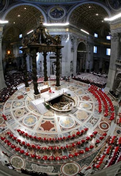 El ambiente entre los purpurados era tenso. No se vieron sonrisas ni gestos de complicidad, salvo alguna media sonrisa en el momento de darse la paz. El propio Joseph Ratzinger parecía cansado, con voz débil y gafas caladas, muy distinto al Ratzinger que pronunció la homilía en el funeral de Juan Pablo II. La ceremonia revistió la solemnidad y el colorido de las grandes ocasiones: en la inmensa basílica resplandecían el rojo cardenalicio, el morado de los obispos, el blanco y el negro de los clérigos y el azul de las monjas.