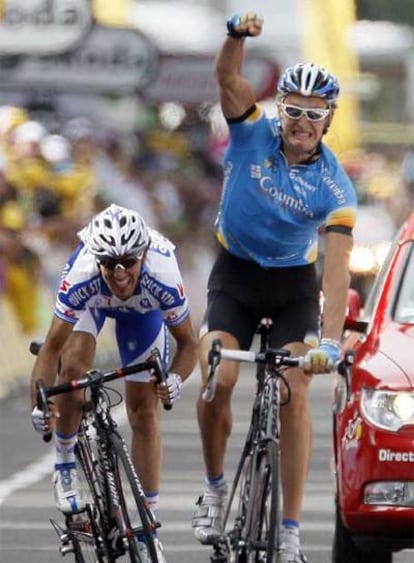 El sabor de la derrota fue mucho más amargo para Carlos Barredo. Para empezar, su compañero de fuga, el alemán Marcus Burghardt, melena rubia y mirada de pillo, le sacaba tres cabezas. Demasiado rápido. Demasiado potente para él, tan menudito. Recurrió entonces a la estrategia del ratón Jerry, de Tom y Jerry: astucia en lugar de fuerza. Cada vez que el alemán se despistaba -cerrando la cremallera de su maillot, arreglándose las zapatillas o mirando hacia atrás- Barredo lanzaba el ataque. "Ha sido muy duro; en los últimos 60 kilómetros Burghardt iba haciendo relevos de mentira", se quejó el de Quick Step. "Es el colofón perfecto a mi Tour: peor no habrían podido irme las cosas. He pasado momentos muy malos, mi padre tuvo un problema en la arteria aorta mes y medio antes de que empezara la ronda francesa, y volvió a enfermar pocos días antes de que yo saliera hacia Brest", se lamentó. Pactar con Burghardt era tarea imposible, ganar al sprint también; por eso Barredo intentó descolgarle antes de la meta. "En los últimos 10 kilómetros me decía que no me daría más relevos, que tenía que ser yo quien llevara el peso de la carrera porque era más rápido en el sprint. Me alegro de que tuviera razón", apuntó el ganador.