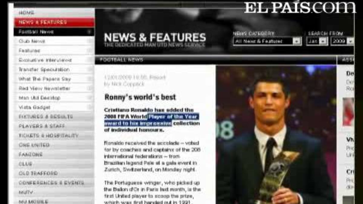 Cristiano Ronaldo está en buena racha y por si acaso todos los títulos que ganó en 2008, como El Balón de Oro, no son suficientes, ahora se ha hace en Suiza con el "FIFA World Player". El futbolista ha sido elegido por seleccionadores y capitanes de 155 federaciones, poniéndole por delante de otros astros del balón, como Lionel Messi, Fernando Torres, Kaká o Xavi.Vídeo: VNEWS