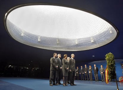 El alcalde de Madrid, Alberto Ruiz-Gallardón, y la ministra de Fomento, Magdalena Álvarez (delante), en la sala baja del monumento a las víctimas del 11-M, en Atocha.