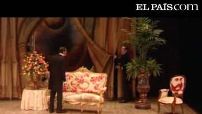 El espectáculo cuenta con un precioso vestuario de Javier Artiñano, estupendas luces de José Manuel Guerra y una escenografía, firmada por el propio director, que utiliza con gran elegancia las falsas candilejas y los telones pintados. Hay gags muy inspirados, como el invento de la tapia abatible del cementerio, homenajes al cine mudo (la taza de tila que vuela a cámara lenta) y un recurso reiterado que no me convence: el juego con las linternas que, directas a la cara, han de ser una considerable molestia para los actores. Germán, un Don Juan en horas bajas, es Jacobo Dicenta, que ha nacido (como Luis Varela, como Saza, como Valeriano Andrés) para interpretar a Enrique Jardiel Poncela. Menos explosivo que esos monstruos, menos pendiente de los efectos, coloca con una precisión y un salero que cortan el hipo: sólo por verle, escucharle y aplaudirle valdría la pena acercarse al teatro. Matizo en el acto la frase, porque aunque cierta es injusta: Chete Lera compone un brigadier muy sobrio, muy eficaz, y que crece muchísimo en el tercer acto, concretamente a partir del monólogo citado. A Carolina Lapausa (Angelina) todavía le falta técnica, que compensa con una sorprendente baza física y tonal: recuerda muy mucho a Amparo Rivelles (Amparito, mejor dicho) en Deliciosamente tontos. Y están muy graciosos Paco Blázquez como Federico y Daniel Huarte como Rodolfo, el poeta. Las dos amigas de Angelina, Ana del Arco (Carlota) y Sara Rivero (Luisa) están justas: tampoco tienen grandes papeles. El resto del reparto, desde Soledad Mallol (Marcela, la esposa del brigadier) hasta el banquero Don Justo (Luis Perezagua) aparecen enojosamente unificados por una peligrosísima tendencia: la tarde que vi la función gritaban como descosidos. A excepción de la habanera de Boronat, que cantan a coro sin estridencias, también resultan un tanto taladrantes los efectos sonoros y las músicas adicionales. El título de la crónica, pues, viene al pelo por partida doble. Bien está que Pérez de la Fuente haya echado su cuarto a espadas para desatascar las orejas de todos los que siguen pensando que Jardiel "está superado", pero su noble lucha debería quedarse en lo metafórico: no toda la parroquia del Canal es dura de oído en un sentido clínico. Baje usted el volumen, hombre, que a Angelina se le entiende todo. Y puestos a pedir, que la "recuperación" del maestro no se quede en flor de un día.