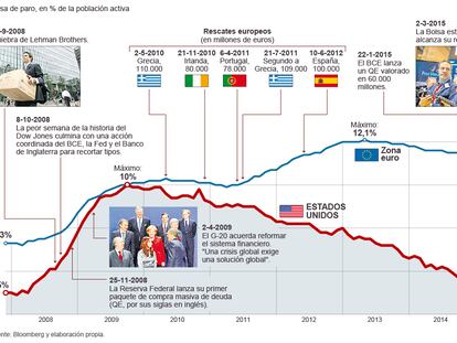 La brecha económica entre EE UU y la zona euro vuelve a crecer en el penúltimo capítulo de esta interminable crisis. La tasa de desempleo estadounidense bajó en febrero un par de décimas, hasta el 5,5%, lo que supone el nivel más bajo desde 2008 y, además, queda ya a la mitad del nivel de desempleo que sufre la zona euro (11,2% en enero, última cifra disponible). Ambas zonas han aplicado políticas presupuestarias y monetarias muy diferentes en los últimos años.