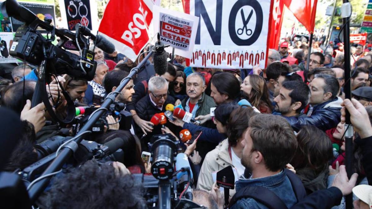 “No sé si tiene razón quien ha presentado una moción de censura, pero en este país hay que censurar políticas. La izquierda tiene entender que solo un frente unido permitirá avances”, ha pedido Fernandez Toxo, en referencia a la iniciativa planteada por Pablo Iglesias, que este año, por primera vez, ha acudido como líder de Podemos a la manifestación de los sindicatos mayoritarios junto con las caras más visibles de su grupo parlamentario (Íñigo Errejón, Rafa Mayoral o Alberto Garzón). También ha habido representntes de Ciudadanos (Miguel Gutiérrez) y del PSOE (Ángel Gabilondo).