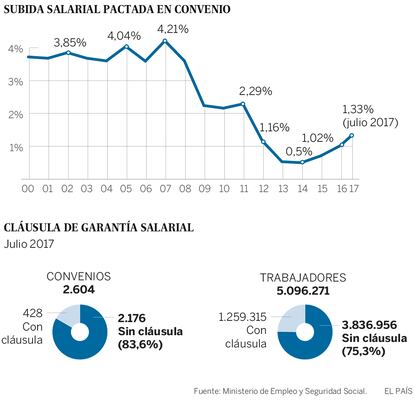 Desde entonces esa salvaguarda, que, como norma general, compensa a los trabajadores por la pérdida de poder adquisitivo si los precios suben más de lo que se pactó para los salarios, ha sobrevivido en menos del 15% de los convenios. En lo que va de año, ha subido algo su uso, hasta el 16,4%. Pero estos porcentajes están muy lejos de los alcanzados cuando los acuerdos estatales de negociación colectiva recomendaban su inclusión y de los alcanzados antes de la crisis.
