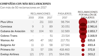 Las aerolíneas que transportan a pocos viajeros (entre 20.000 y 100.000 en 2017) son las que tienen peores tasas de reclamaciones ante la Agencia Estatal de Seguridad Aérea (Aesa), según los datos oficiales obtenidos por EL PAÍS. Plus Ultra, una compañía que vuela a Caracas y Lima desde Tenerife Norte y Madrid, tuvo 333 expedientes en la agencia dependiente del Ministerio de Fomento el año pasado, cuando llevó a sus destinos a 98.794 pasajeros según los datos de los aeropuertos de Aena. Son 3.371 reclamaciones por millón de pasajeros, tasa que multiplica casi por 20 a la de Norwegian, la gran compañía (más de un millón de pasajeros en España) con más quejas. Este diario trató, sin éxito, de obtener su versión.