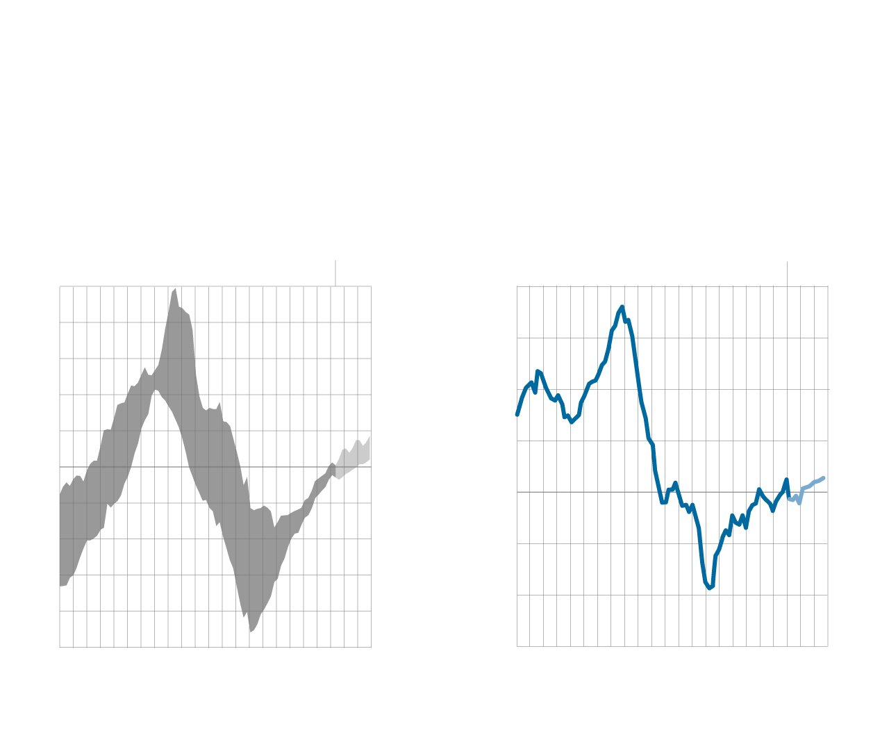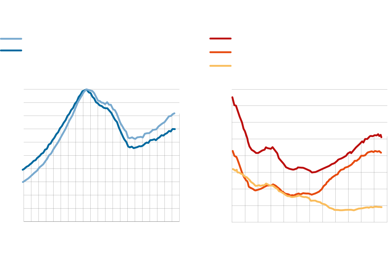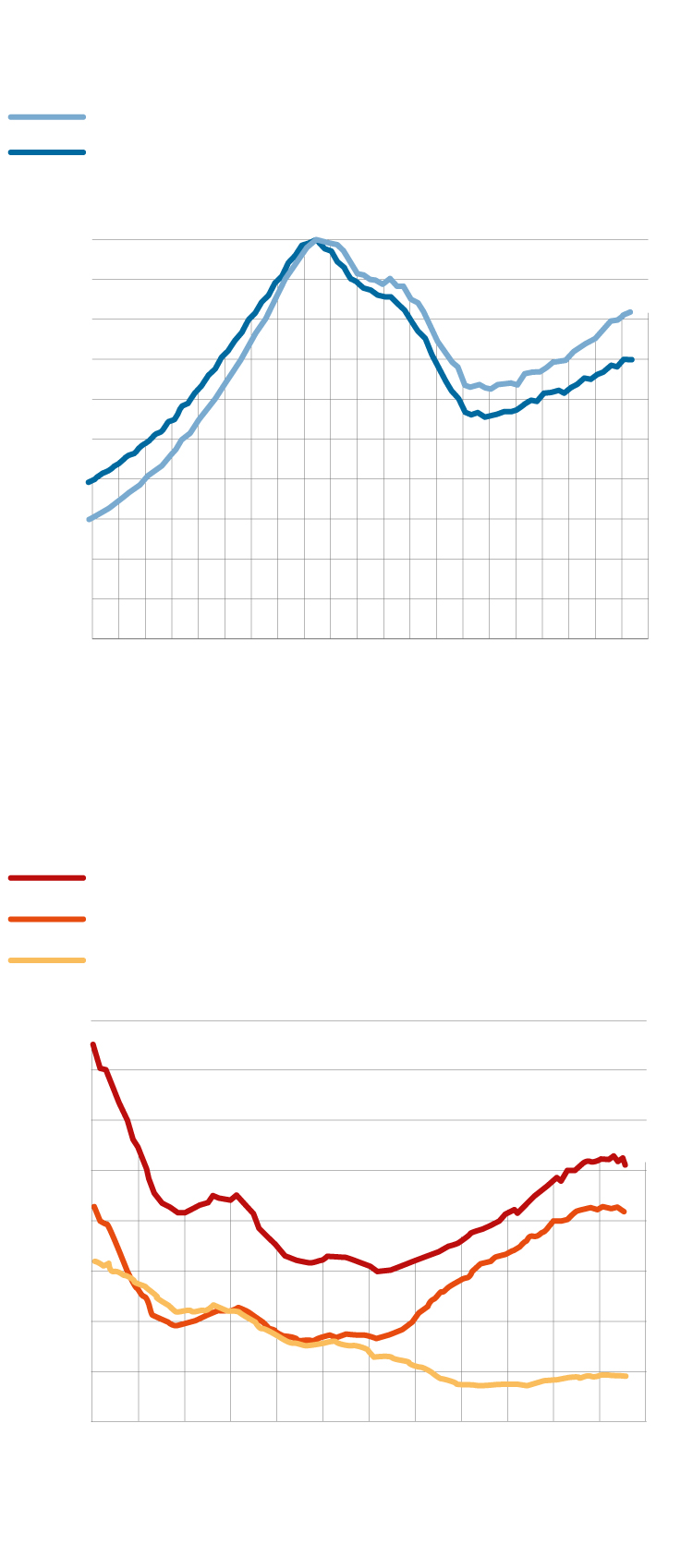 El área sombreada representa la franja entre mínimos y máximos de un grupo de indicadores del sector inmobiliario basados en precios, rentas, coste de alquiler y tipos de interés.