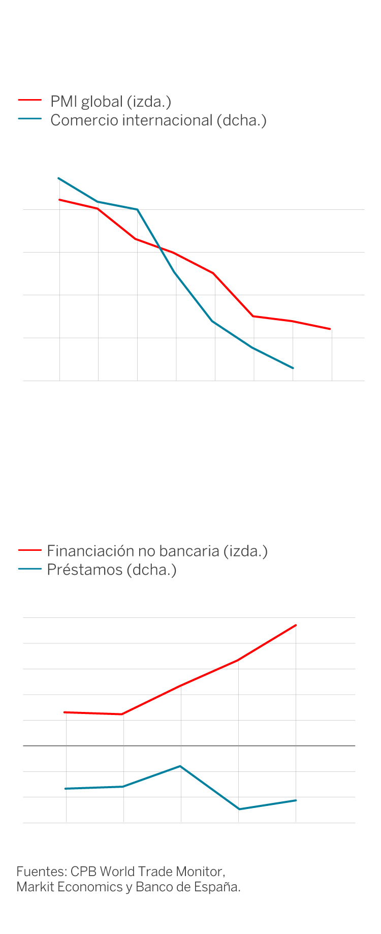 La política monetaria, ese otro titán, se esfuerza en contrarrestar las tendencias recesivas, con inyecciones masivas de liquidez y recortes de tipos de interés. Con eso espera detener la pérdida de confianza, animar las empresas a invertir y los consumidores a gastar, y alejar el espectro de una “japonización”. En sus recientes previsiones el BCE anticipa un repunte del crecimiento europeo a partir de mediados de 2020, algo que, según el Banco de España, limitaría la desaceleración de la economía española. No obstante, la acción de los banqueros centrales genera nuevos riesgos, como un excesivo endeudamiento de empresas que solo son viables con dinero gratis. También tiende a perjudicar la banca regulada, con respecto a la que opera en la sombra, al margen de la normativa. En España, los préstamos bancarios se reducen un 1,5% mientras que la financiación no-bancaria crece un 14,4% (datos hasta octubre). En suma, la política monetaria ultra-expansiva irá perdiendo eficacia, y su lógica la abocará a inyectar estímulos en dosis cada vez más potentes, generando nuevos riesgos para la sostenibilidad financiera.