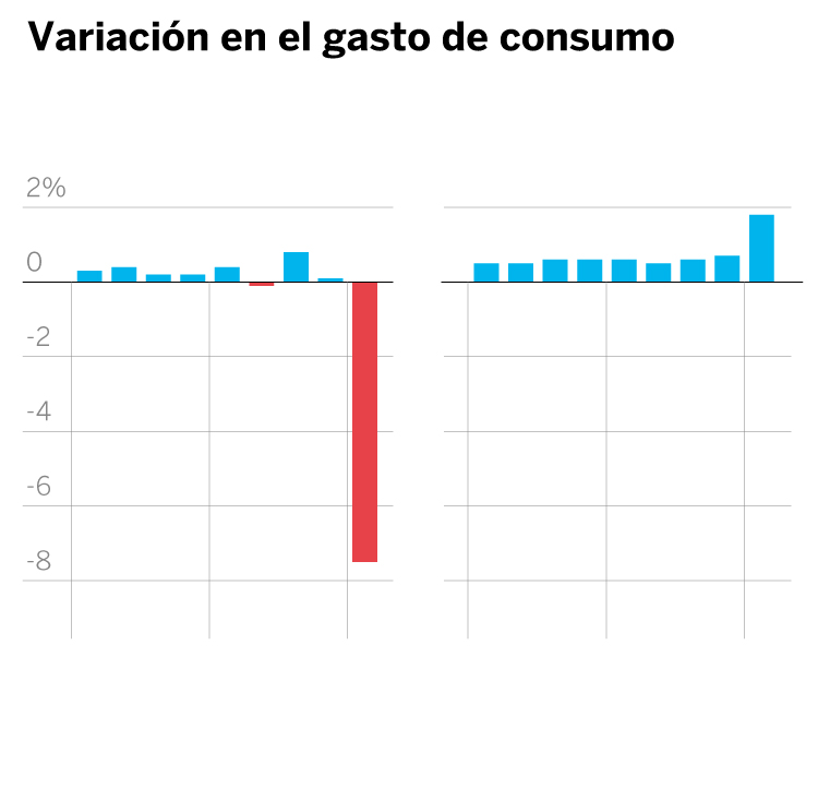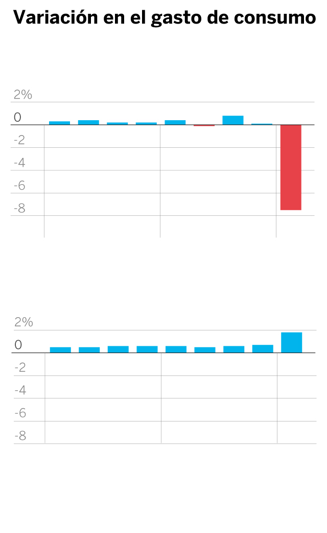 El desglose por partidas brinda cifras igual de abrumadoras. El consumo se hunde un 5,1% trimestral entre enero y marzo. El de los hogares todavía más: un 7,5% —en los peores momentos de la crisis precedente cayó como mucho un 1,63% en el tercer trimestre de 2012 y un 1,69% en el cuarto trimestre de 2008, casi cinco veces menos—. Solo crece el gasto de las Administraciones Públicas, que se dispara un 1,8%, un incremento trimestral que no se anotaba desde el 2007. La inversión se desploma otro 5,3%. Y las exportaciones e importaciones caen lo mismo: un 8,4%.