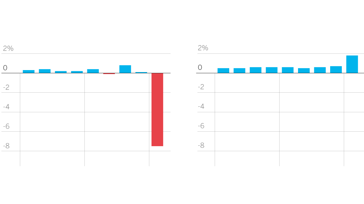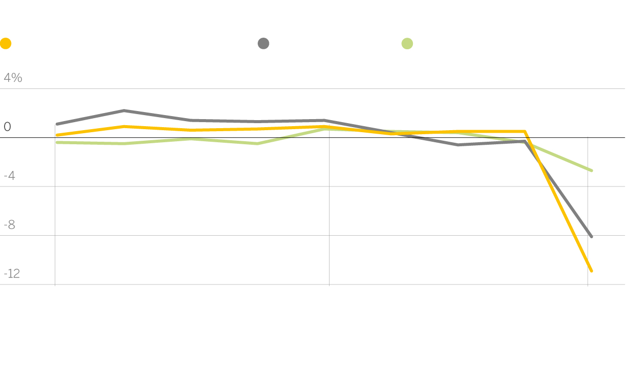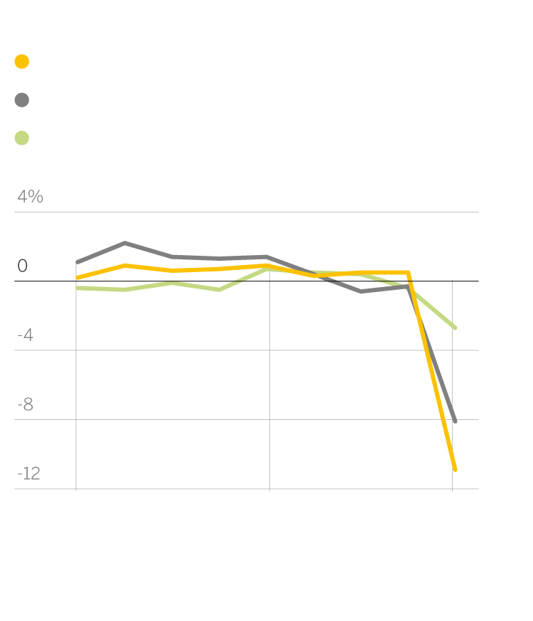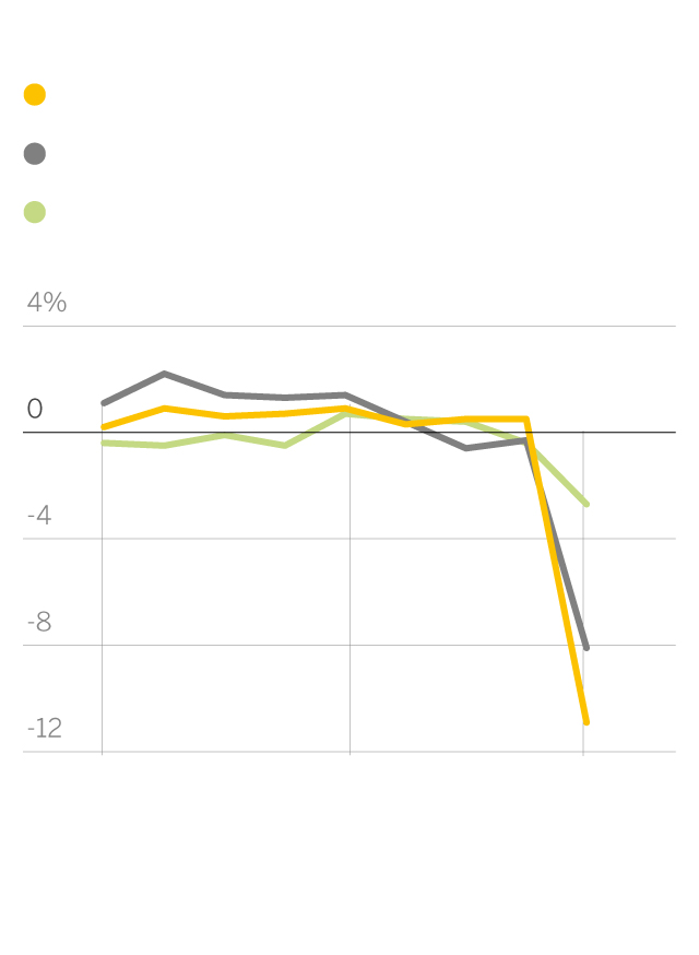 Por sectores, los más afectados son el comercio, transporte y hostelería, con un batacazo del 10,9%, y las actividades artísticas y recreativas, con una caída en picado del 11,2%. Las actividades profesionales y científicas pierden un 8%. Y la información y comunicaciones, un 5,5%. La industria retrocede un 2,7%. Y la construcción se derrumba un 8,1% a pesar de que en esas dos semanas el cierre no le afectó tan directamente. Únicamente se mantienen en pie las actividades financieras y de seguros, que crecen un 1%. Y la Administración Pública, sanidad y educación, que aumentan un 0,8%.