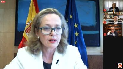 La vicepresidenta económica, Nadia Calviño, observa un “cambio de tendencia" en la economía “desde que terminó la hibernación, con una cierta recuperación de la actividad y el empleo, aunque aún quedan sectores por iniciar la remontada”. Con la “máxima cautela y tomando los datos con prudencia”, ha subrayado este jueves en una charla organizada por el Consejo General de Economistas, “si la desescalada continúa por la misma senda, la economía española seguirá recuperándose con un perfil de V asimétrica, con una tasa de crecimiento importante el año próximo”. Para que se dé ese escenario, ha dicho, es “importante” que el crecimiento mundial acompañe con un rebote en 2021 y que Europa "acierte con las medidas” a tomar. La titular de Economía ha anunciado también la creación de dos consejos asesores: de asuntos económicos y de inteligencia artificial, respectivamente.