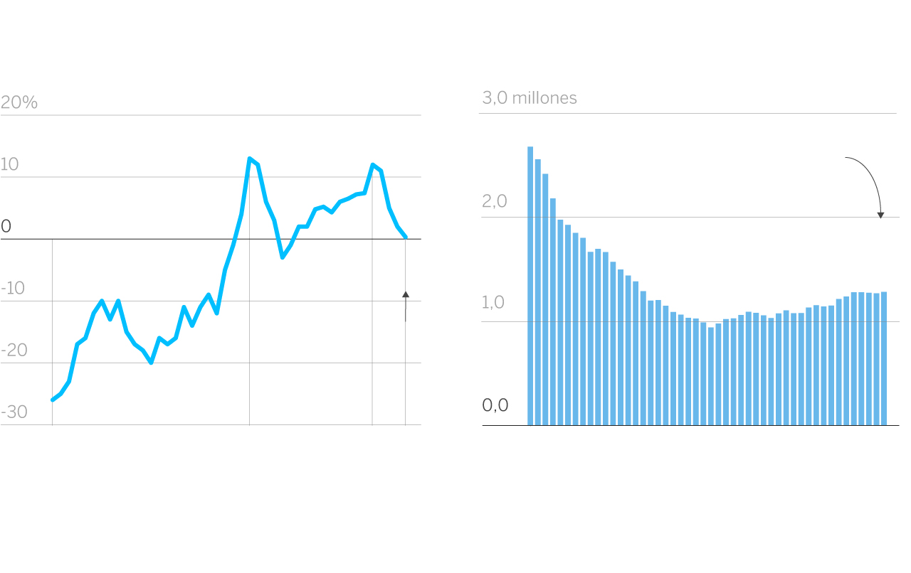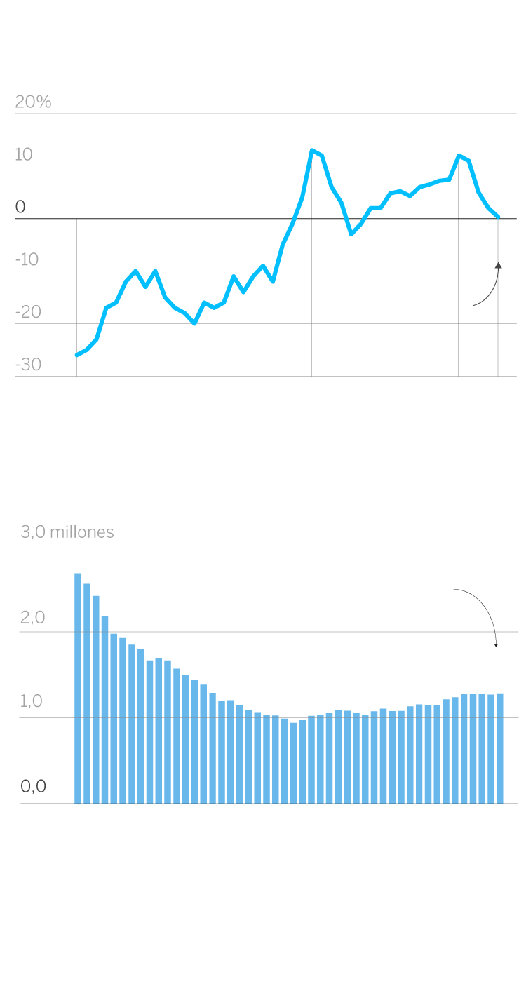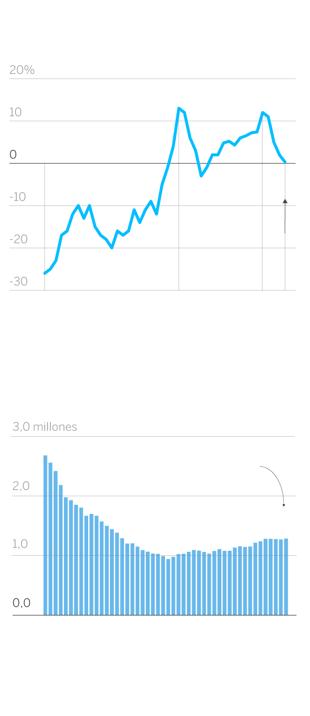 Dicho esto, los datos de empleo en la construcción no cuentan exactamente la misma historia. “La recesión debería reflejarse en una caída de los puestos de trabajo en el sector. Sin embargo, no lo hace”, señala Francisco Vidal, economista jefe de Intermoney. Eso sí, experimenta una fuerte desaceleración después de que llegase a representar uno de cada cuatro empleos creados en 2018. En la encuesta de población activa, la ocupación crecía al 12% a finales de 2018. Y ha acabado 2019 con un escaso avance del 0,3%. “Es la actividad que mejor empezó el año y la que más se frenó al cierre de 2019”, subraya María Jesús Fernández, analista de Funcas.
