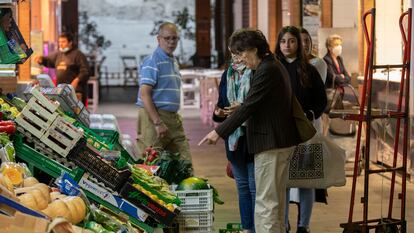 Varias personas en el interior del mercado de Triana (Sevilla), a finales de marzo.Foto: PACO PUENTES | Vídeo: EPV