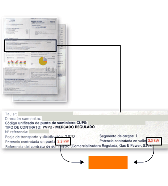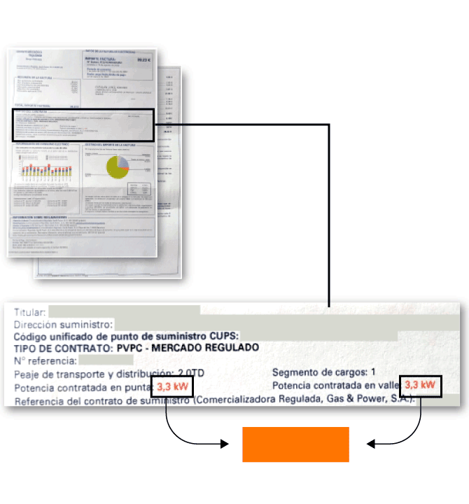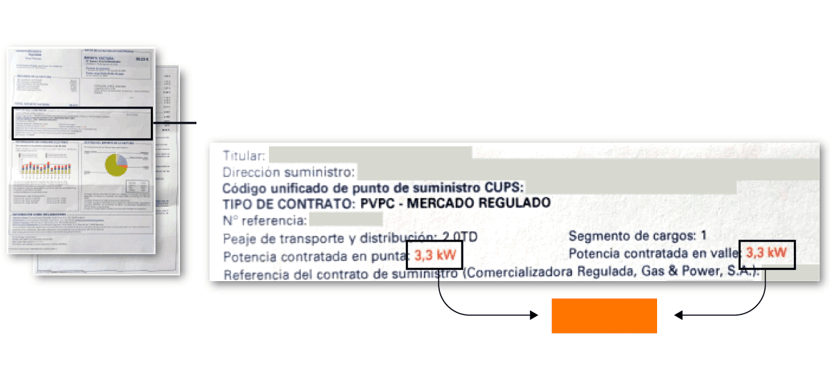 Después de sumar el consumo estimado de todos los electrodomésticos que podría utilizar en un mismo momento, contraste la cifra con la de potencia contratada. Para saber cuál es, tenga a mano su factura, que tendrá un formato parecido a este: