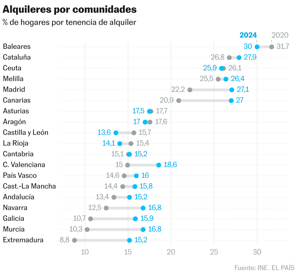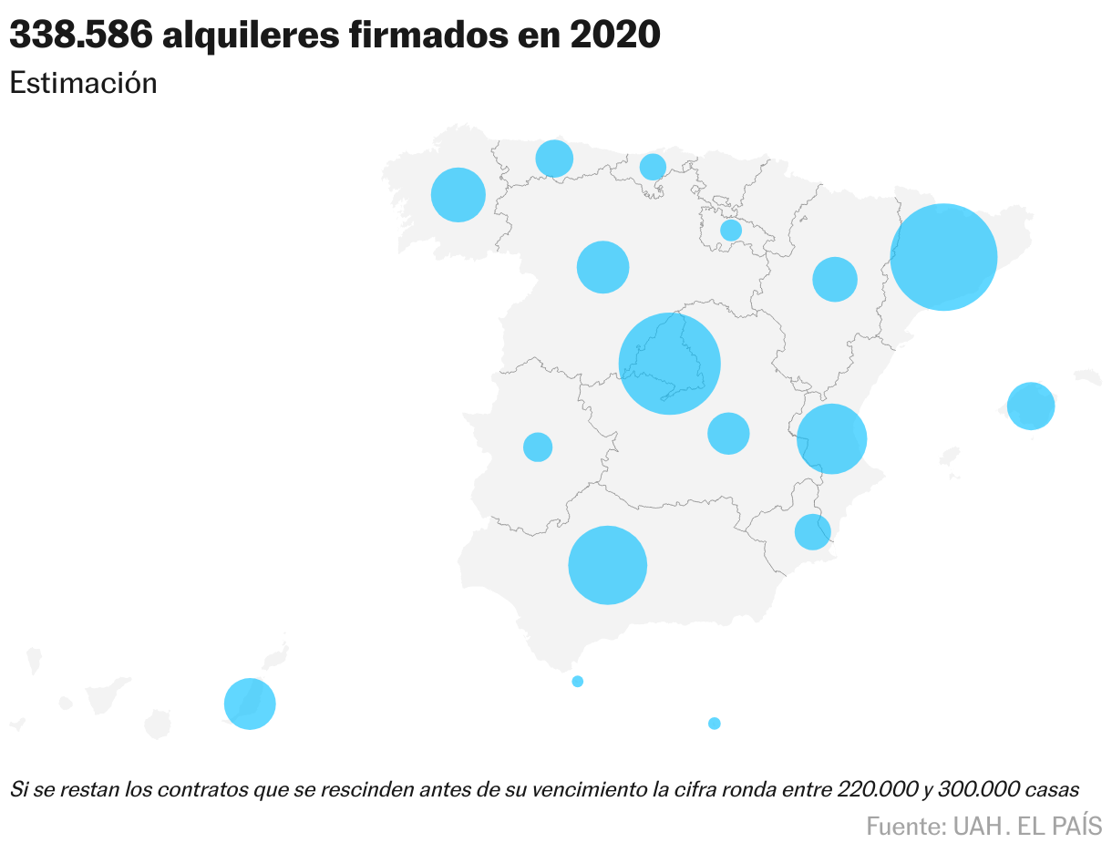 La proyección encaja con otro trabajo realizado por Josep Oliver, catedrático emérito de la Universidad Autónoma de Barcelona, que calculó más de 500.000 firmas de arrendamiento en 2020, incluyendo renovaciones. A falta de una estadística oficial sobre alquileres —una carencia estructural del mercado español—, estas aproximaciones ofrecen una ventana razonable sobre la magnitud de un fenómeno que amenaza con tensionar más todavía uno de los grandes problemas que enfrenta España. Preguntado por la cuestión, el Ministerio de Vivienda reconoce “ser consciente de la situación que pueden verse obligados a afrontar muchos inquilinos” y emplaza a las comunidades a aplicar la ley de vivienda. En paralelo, el PSOE ha presentado esta semana en el Congreso un paquete de medidas orientado, entre otros objetivos, a promover una bajada de las rentas.