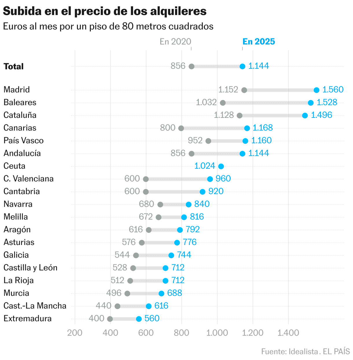 Si se coge un mapa de España, se observa que muchos de los mayores incrementos en estos cinco años se han producido en los territorios más turísticos. La lista la encabeza la Comunidad Valenciana, con un repunte del 60% entre abril de 2020 y abril de 2025, según los precios medios que se extraen de Idealista. Entre la lista también figuran Baleares y Canarias, con aumentos del 48% y 46%, respectivamente. La media nacional es de un 33%. Es decir, que si en 2020 un piso de 80 metros cuadrados costaba 856 euros en promedio, ahora vale 1.144 euros al mes. En Madrid y Cataluña estos precios son incluso superiores. De hecho, en Barcelona el precio de oferta superó en abril de este año los 1.900 euros, mientras que en Madrid llegó a los 1.700 euros.