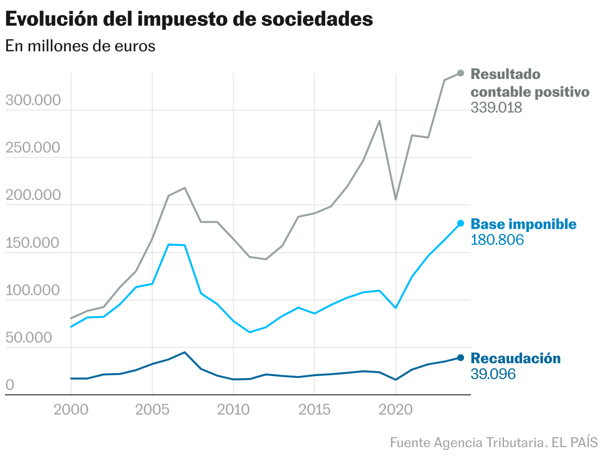 Este es uno de los factores que explican por qué la base imponible —la cantidad sobre la que efectivamente se calcula el impuesto— se ha ido alejando progresivamente del resultado contable declarado por las empresas, una cifra que, en cierto modo, refleja sus beneficios. Es decir, lo que ganan una vez restados los gastos. En 2024, último año con datos disponibles, las empresas declararon ganancias por 339.000 millones de euros. No obstante, la base imponible final se redujo a 180.806 millones tras la aplicación de créditos fiscales y otros mecanismos de aminoración, como la exención de rentas obtenidas en el extranjero.