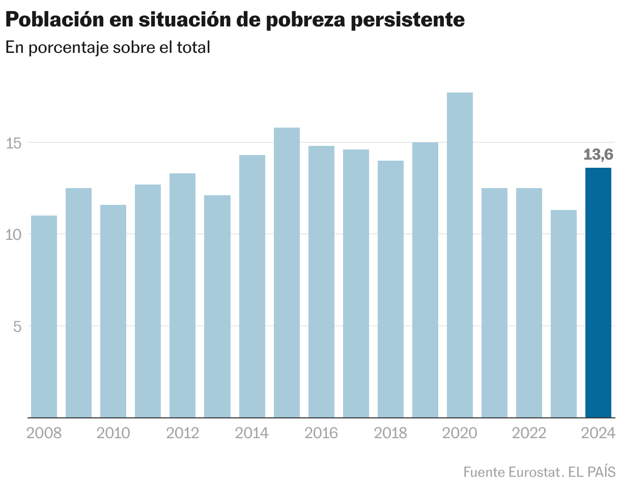 La pobreza persistente vuelve a crecer en España después de años de cierta corrección y retroceso. En 2024, el 13,6% de la población vivió en situación de carencia prolongada, según datos de Eurostat, la agencia estadística europea. Es decir, fueron pobres ese año y lo habían sido también en al menos dos de los tres ejercicios anteriores. El número de afectados sería de 6,7 millones de personas, calculado sobre las cifras de población del INE. Un dato que llama especialmente la atención si se compara con el contexto macroeconómico general: el empleo ha mejorado, el paro ha disminuido y los sueldos más bajos han subido gracias al impulso del salario mínimo y a las revalorizaciones ligadas a la inflación. Sin embargo, la precariedad que se enquista no solo no cae, sino que repunta, afectando cada vez más a la infancia y a los hogares con migrantes.
