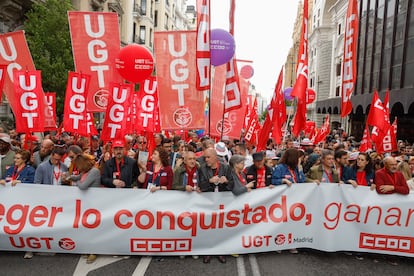 El Primero de Mayo es la gran cita anual de los sindicatos, en la que exponen sus prioridades. El año pasado pusieron mucho foco en la reducción de jornada, a pocos meses de la votación en el Congreso en la que la mayoría de derechas de PP, Vox y Junts terminó tumbando la iniciativa.