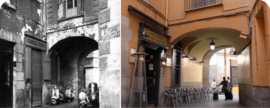 Pasadizo de San Ginés en torno a los años 60 y hoy. Cedida por San Ginés