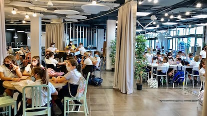 En el Colegio Internacional Torrequebrada, en Málaga, todas las aulas están abiertas al exterior. “Ahí se tiraron tabiques y se construyó un espacio de 500 metros cuadrados donde antes había laboratorios, un comedor, biblioteca, aulas.... Y se ha dejado un entorno de aprendizaje colaborativo; una especie de café teatro donde los chavales pueden perfectamente examinarse dando un concierto o haciendo una exposición pública de un proyecto, con cortinas que se abren y se cierran”, explica Picó, responsable de la transformación a través de Espacios Maestros.