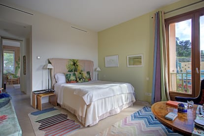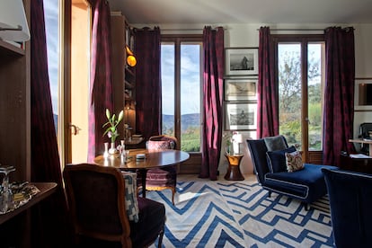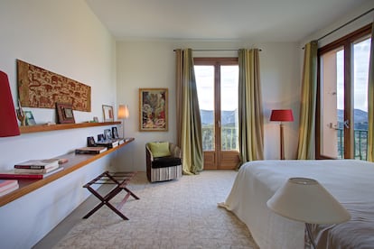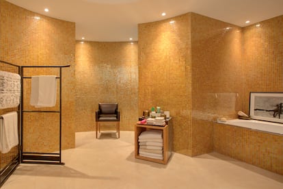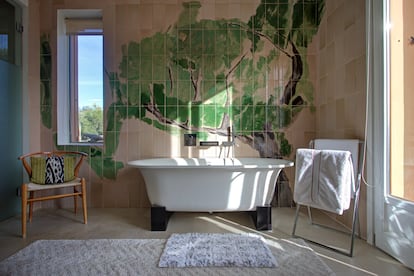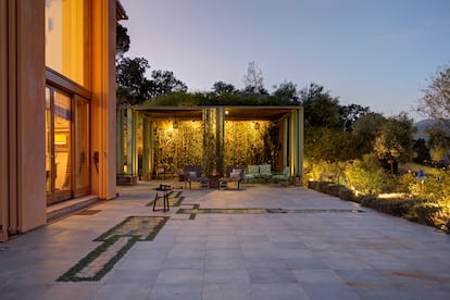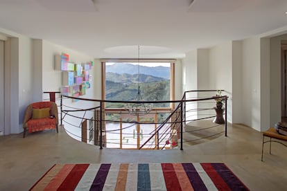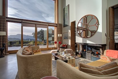 En la de entrada, un ventanal de siete metros de altura enmarca la sierra. Alberga dos dormitorios con baño y la suite principal, con chimenea, vestidor y baño. El corazón de la casa se articula en torno a un salón de invierno de doble altura con chimenea, coronado por un fresco tridimensional del artista portugués Pedro Calapez y una lámpara escultórica de diseño francés. En esta planta se disponen la cocina con office y comedor —conectada con el salón exterior de verano—, biblioteca, aseo, otra suite y un hammam.