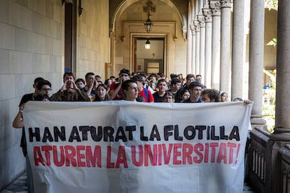 En la Universidad de Barcelona, un piquete informativo del Sindicato de Estudiantes ha recorrido las aulas de la Facultad de Filosofía informando de los motivos de la protesta y un centenar de estudiantes han celebrado en el patio una asamblea, previa a la manifestación. “Ya van 18 mil niños asesinatos y a saber cuántos más muertos por enfermedades. No podemos estar callados”, reivindicaba David, de 21 años. “Estamos aquí para reivindicar la lucha del pueblo palestino y que nuestros gobiernos europeos paren de cooperar con Israel”, añadía Aqa. Los estudiantes también reclaman a la UB que rompa todos los acuerdos con Israel y su universidad, informa Lorraine Delorenzo.