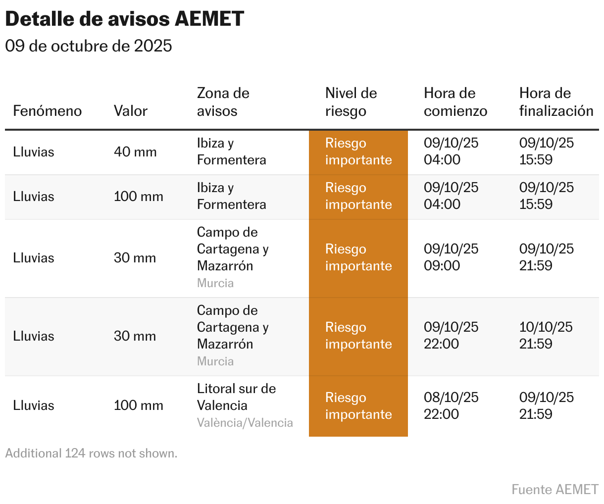 Los avisos naranjas por lluvias y tormentas se mantienen activos, al menos, hasta última hora del viernes, mientras que los avisos amarillos para la Comunidad Valenciana y la Región de Murcia están previstos para durar hasta la última hora del sábado. El organismo meteorológico recomienda extremar la precaución ante posibles inundaciones repentinas, desbordamientos de cauces y acumulaciones de agua en zonas bajas o próximas a ramblas.