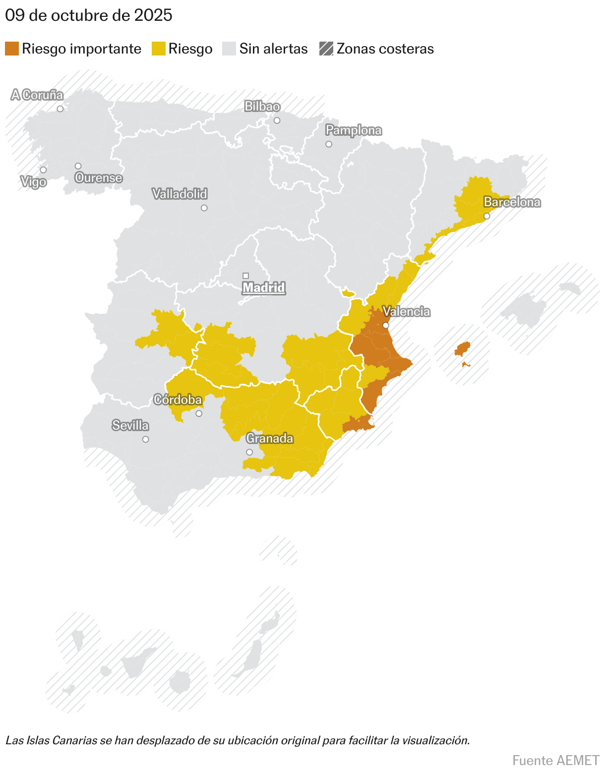 La Aemet también mantiene activados los avisos naranjas por peligro importante en la Comunidad Valenciana, la Región de Murcia, Cataluña, Andalucía y Baleares —especialmente en Ibiza y Formentera—, mientras que el resto del litoral mediterráneo y áreas del interior oriental se encuentran en aviso amarillo. La intensidad y persistencia de las lluvias pueden provocar inundaciones, crecidas repentinas y complicaciones en la red viaria.