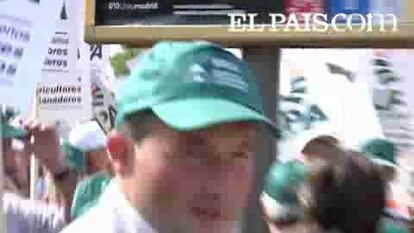 Los agricultores que coreaban: "estabilidad de precios", "garantía de rentas" o "nos deben el IPC de los últimos 20 años". A la protesta han acudido ganaderos y agricultores de Castilla La Mancha, Almería, Galicia, Málaga.