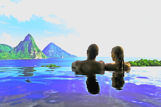 Piscina del hotel Jade Mountain. Isla de Santa Lucía.Una piscina infinita no es solo aquella en la que te cuesta mucho hacerte un largo. Con este término (Infinity Pool, en inglés) se designa a las que han sido diseñadas (o creadas por la naturaleza) de forma que el agua parece extenderse hasta el horizonte, fundirse con el mar o flotar en el aire. Todo muy zen,