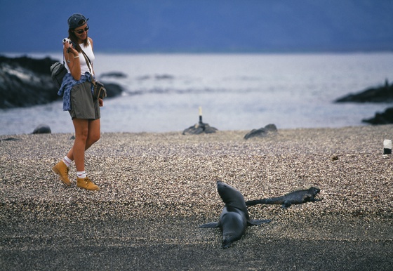 Una turista fotografía a unos lobos marinos en Punta Espinosa, en la Isla volcánica Fernandina, en las galápagos ( Ecuador). /Gonzalo Azumendi