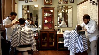 Un joven mira todos los estilos de afeitado disponibles. Luce una prominente barba que, según él, cuida como parte de su identidad y símbolo de modernidad. A su lado, la luz entra por grandes ventanales que iluminan varias fotografías antiguas que cuelgan de la pared. “Estamos en plena plaza del Dos de Mayo, en el centro de Malasaña, así que sobre todo viene un público más joven, más moderno”, afirma Pelayo Herrero. Detrás de él, el cliente pide un afeitado básico que cuesta 15 euros. El barbero le invita a relajarse en una de las sillas de rejilla y pone un paño de agua fría sobre sus ojos. “La barba ya no es solo exclusividad de los hipsters (anglicismo utilizado para referirse a jóvenes que lucen tupidas barbas, gafas de pasta y un estilo bohemio). Empieza a verse como algo normal”, explica Andrea de Pascali, uno de los barberos del negocio, mientras mueve con naturalidad la navaja que utiliza en sus afeitados. Tiene 37 años, un denso bigote y unas manos que parece que han cortado patillas toda la vida.