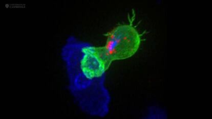 Mire el vídeo, porque posiblemente usted esté vivo gracias a sus protagonistas, amorfos y con un tamaño similar a la décima parte del ancho de un pelo humano. Lo que parece un juego de comecocos pintados por Salvador Dalí es nuestro ejército de élite de glóbulos blancos luchando a muerte contra el cáncer. Las masas amorfas de color naranja o verde son linfocitos T citotóxicos, las células que patrullan nuestro organismo identificando y destruyendo las células cancerígenas, en azul.