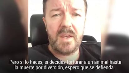 Ha pedido también el fin del festival de la carne de perro de Yulin (China) y ha condenado la caza de ballenas en las islas Feroe. "Trofeos de caza, la caza furtiva, festivales de tortura a perros... Parece una batalla perdida. Pero vamos a luchar de cualquier manera", es la reflexión final de Gervais.